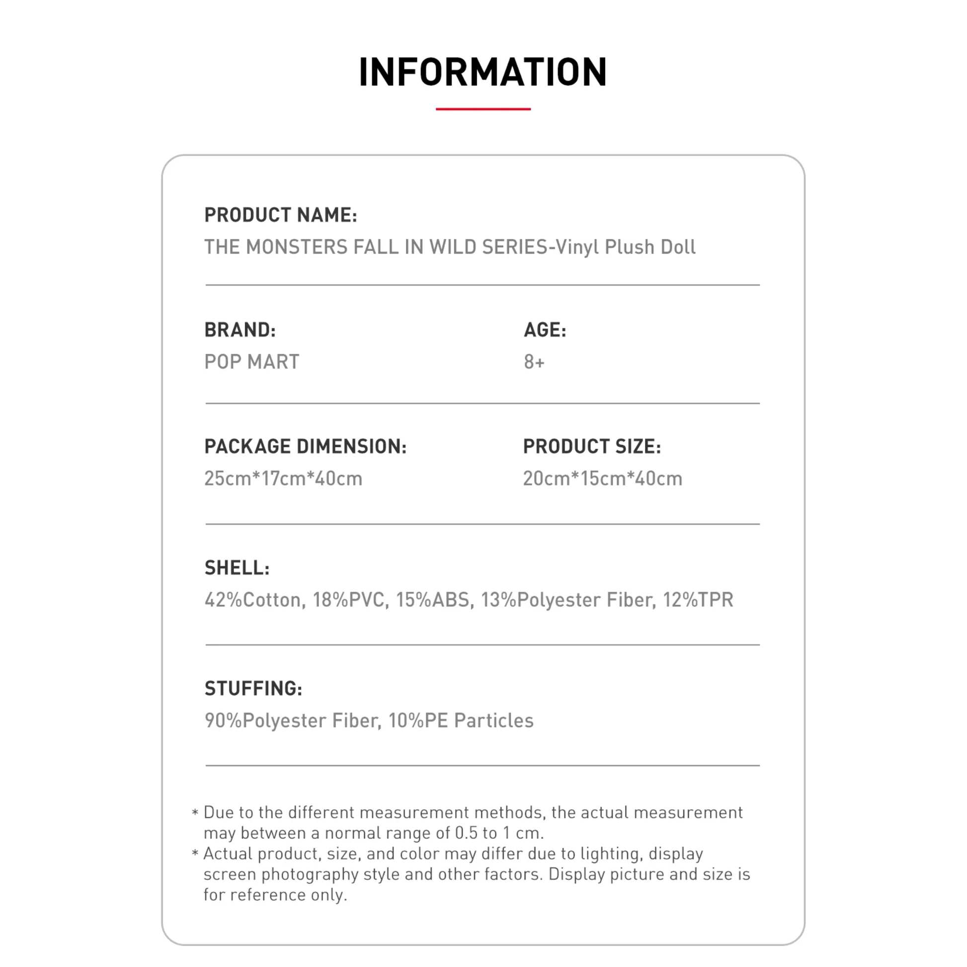 As a trusted name in the collectible world, I can confidently say that the POP MART LABUBU THE MONSTERS Fall In Wild Vinyl Plush Doll is crafted from premium polyester, cotton, and PVC materials. Measuring approximately 40cm in height, it’s perfectly sized for both cozy cuddles and eye-catching display as a treasured collector’s piece.
